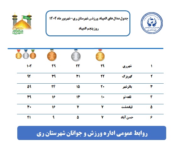 جدول مدالها تا پایان روز پنجم المپیاد ورزشی شهرستان ری