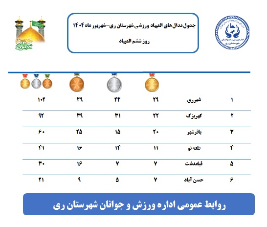 جدول مدالها تا پایان روز ششم المپیاد ورزشی شهرستان ری