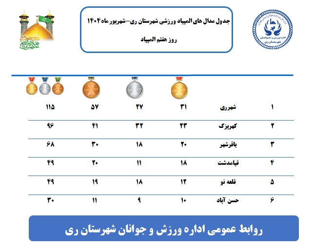 جدول مدالها تا پایان روز هفتم المپیاد ورزشی شهرستان ری